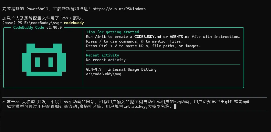 小伙伴们,今天想和大家分享借助 Codebuddy,亲手将一个创意火花变成了一个实实在在的、智能的SVG动画生成器。这个工具的核心想法很酷:你只需输入一段简单的描述(比如“生成一个昼夜循环的动画”),它就能通过AI大模型的理解,自动生成相应的、精美的SVG动态图形,并允许你实时预览、轻松导出为GIF或MP4视频。