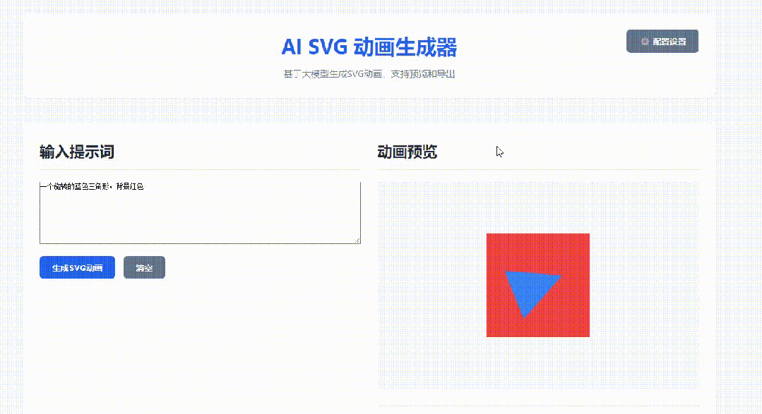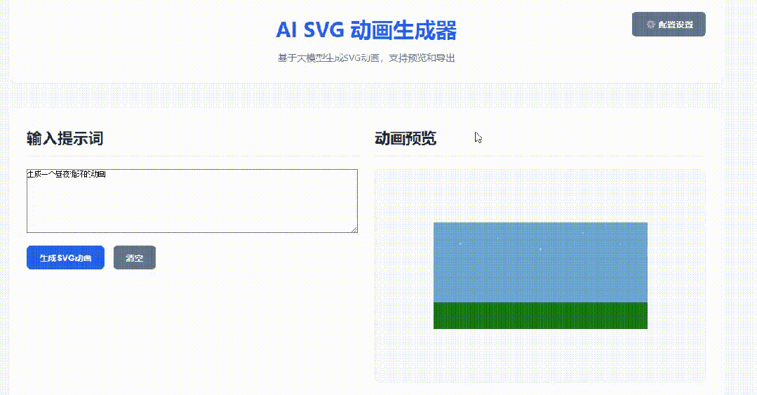 基于ai 大模型 开发一个设计svg 动画的网站,根据用户输入的提示词自动生成相应的svg动画,用户可预览导出gif 或者mp4AI大模型可通过用户配置如硅基流动,魔塔社区等,用户填写url,apikey,大模型名称。