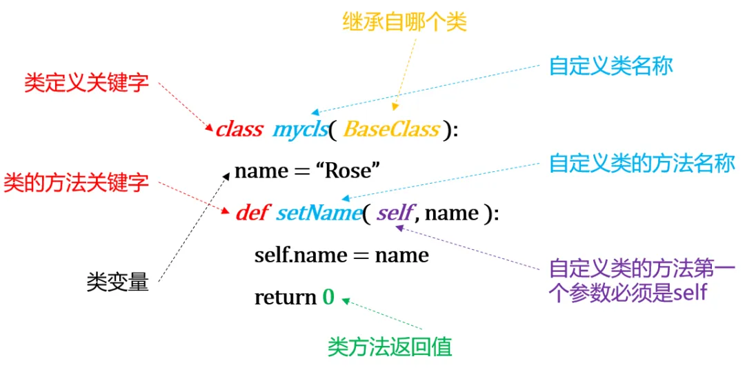 第一行,class类定义关键字,空格后接类名称和圆括号,圆括号内填写继承那个类(可以为空,表示继承基类),最后是冒号换行。