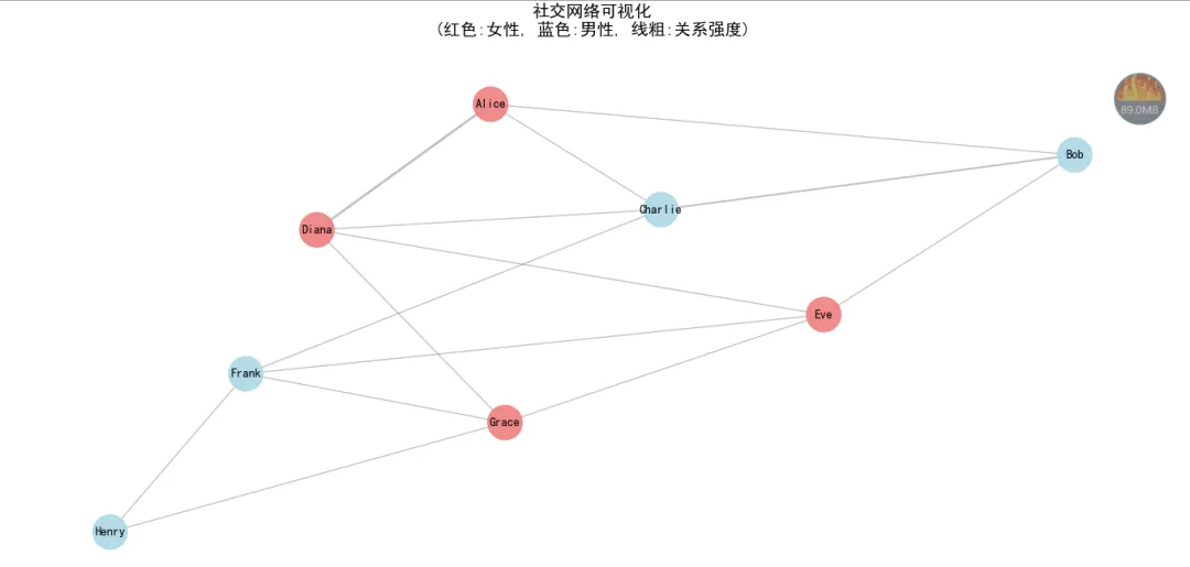 # -*- coding: utf-8 -*-# @Author : 小红牛# 微信公众号:wdPythonimport networkx as nximport matplotlib.pyplot as pltfrom matplotlib.colors import ListedColormapimport numpy as np# 设置中文字体,解决中文显示问题plt.rcParams['font.sans-serif'] = ['SimHei', 'Microsoft YaHei', 'DejaVu Sans']plt.rcParams['axes.unicode_minus'] = False# 创建社交网络图G = nx.Graph()# 添加节点(用户)users = [{"id": 1, "name": "Alice", "age": 25, "gender": "F"},{"id": 2, "name": "Bob", "age": 30, "gender": "M"},{"id": 3, "name": "Charlie", "age": 35, "gender": "M"},{"id": 4, "name": "Diana", "age": 28, "gender": "F"},{"id": 5, "name": "Eve", "age": 32, "gender": "F"},{"id": 6, "name": "Frank", "age": 40, "gender": "M"},{"id": 7, "name": "Grace", "age": 27, "gender": "F"},{"id": 8, "name": "Henry", "age": 45, "gender": "M"}]# 添加带属性的节点for user in users:G.add_node(user["id"], **user)# 添加边(好友关系)friendships = [(1, 2), (1, 3), (1, 4), (2, 3), (2, 5),(3, 4), (3, 6), (4, 5), (4, 7), (5, 6),(5, 7), (6, 7), (6, 8), (7, 8),# 加强某些关系(权重)(1, 4, {"weight": 2.0}), # Alice和Diana更亲密(2, 3, {"weight": 1.5}), # Bob和Charlie更亲密]for edge in friendships:if len(edge) == 2:G.add_edge(edge[0], edge[1], weight=1.0)else:G.add_edge(edge[0], edge[1], **edge[2])def analyze_social_network(G):"""分析社交网络"""print("=== 社交网络分析 ===")# 基本统计print(f"1. 网络规模:")print(f" 节点数: {G.number_of_nodes()}")print(f" 边数: {G.number_of_edges()}")print(f" 网络密度: {nx.density(G):.3f}")# 度中心性print(f"\n2. 度中心性(好友数最多的用户):")degrees = dict(G.degree())for node_id, degree in sorted(degrees.items(), key=lambda x: x[1], reverse=True)[:3]:name = G.nodes[node_id]["name"]print(f" {name} (ID:{node_id}): {degree} 个好友")# 紧密中心性print(f"\n3. 紧密中心性(信息传递最快的用户):")closeness = nx.closeness_centrality(G)for node_id, score in sorted(closeness.items(), key=lambda x: x[1], reverse=True)[:3]:name = G.nodes[node_id]["name"]print(f" {name}: {score:.3f}")# 中介中心性print(f"\n4. 中介中心性(关键枢纽用户):")betweenness = nx.betweenness_centrality(G)for node_id, score in sorted(betweenness.items(), key=lambda x: x[1], reverse=True)[:3]:name = G.nodes[node_id]["name"]print(f" {name}: {score:.3f}")# 社区检测print(f"\n5. 社区检测(使用Louvain算法):")try:import community as community_louvainpartition = community_louvain.best_partition(G)communities = {}for node, comm_id in partition.items():communities.setdefault(comm_id, []).append(G.nodes[node]["name"])for comm_id, members in communities.items():print(f" 社区 {comm_id}: {', '.join(members)}")except ImportError:print(" 请安装python-louvain包: pip install python-louvain")# 查找影响力大的用户(PageRank)print(f"\n6. PageRank(用户影响力排名):")pagerank = nx.pagerank(G, weight='weight')for node_id, score in sorted(pagerank.items(), key=lambda x: x[1], reverse=True):name = G.nodes[node_id]["name"]print(f" {name}: {score:.4f}")# 查找关键路径print(f"\n7. 网络中的关键路径:")all_pairs_shortest = dict(nx.all_pairs_shortest_path_length(G))max_distance = 0critical_pair = Nonefor source in G.nodes():for target in G.nodes():if source < target:distance = all_pairs_shortest[source][target]if distance > max_distance:max_distance = distancecritical_pair = (source, target)if critical_pair:name1 = G.nodes[critical_pair[0]]["name"]name2 = G.nodes[critical_pair[1]]["name"]print(f" 最长路径: {name1} ↔ {name2} (距离: {max_distance})")# 查找三角形关系print(f"\n8. 三角形关系(共同好友圈):")triangles = nx.triangles(G)for node_id, count in sorted(triangles.items(), key=lambda x: x[1], reverse=True):if count > 0:name = G.nodes[node_id]["name"]print(f" {name} 参与了 {count} 个三角形关系")def visualize_network(G):"""可视化网络"""plt.figure(figsize=(12, 8))# 使用Spring布局pos = nx.spring_layout(G, k=1, iterations=50, seed=42)# 按性别设置节点颜色node_colors = []for node in G.nodes():gender = G.nodes[node]["gender"]node_colors.append('lightcoral' if gender == 'F' else 'lightblue')# 按权重设置边宽度edge_weights = [G[u][v].get('weight', 1.0) for u, v in G.edges()]# 绘制网络nx.draw_networkx_nodes(G, pos, node_size=800,node_color=node_colors, alpha=0.9)nx.draw_networkx_edges(G, pos, width=edge_weights,alpha=0.5, edge_color='gray')nx.draw_networkx_labels(G, pos,labels={n: G.nodes[n]["name"] for n in G.nodes()},font_size=10, font_weight='bold')# 添加标题plt.title("社交网络可视化\n(红色:女性, 蓝色:男性, 线粗:关系强度)",fontsize=14, pad=20)plt.axis('off')plt.tight_layout()# 保存图片plt.savefig('social_network.png', dpi=150, bbox_inches='tight')plt.show()# 执行分析analyze_social_network(G)visualize_network(G)
