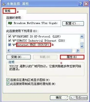 2、单击 “属性” 按钮,打开 “本地连接 属性” 对话框,如图所示;