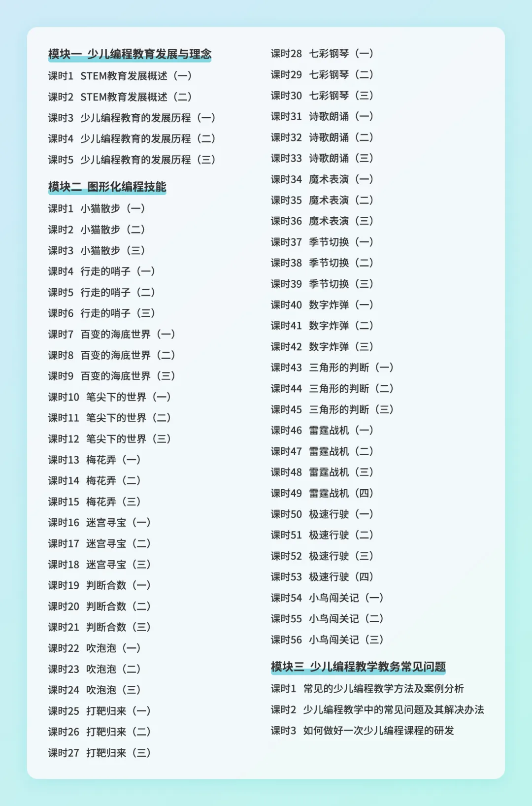《少儿编程指导师(Scratch)》证书课程共3大模块,64课时。本系列课程除Scratch编程8大软件模块及5大拓展模块核心指令的讲解与练习之外,还配备了行业发展史、编程教学理念与方法论、日常教学常见问题及处理方式等核心内容。