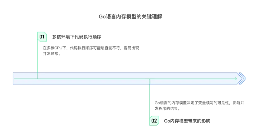 内存模型,就是语言对你承诺:在并发场景下,一个 goroutine 写入的数据,在什么条件下能被另一个 goroutine 观察到。