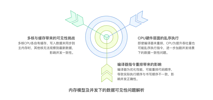 Core A 写入的数据,可能先在 Cache A 里,还没同步到主内存,Core B 就看不到。