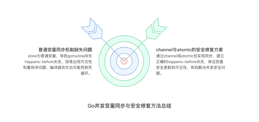 // ✅用 channelch := make(chanstruct{})gofunc() { x = 1 ch <- struct{}{}}()<-chfmt.Println(x) // 安全✓// ✅用 atomicvar done atomic.Boolgofunc() { x = 1 done.Store(true)}()for !done.Load() {}fmt.Println(x) // 安全✓