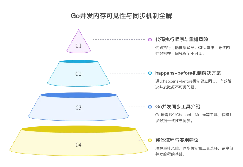 你写的代码的执行顺序 ↓ 可能被编译器重排 + CPU 重排 + 缓存不一致 ↓ 导致goroutine 之间数据不可见 ↓ 解决方案是用 happens-before 机制建立同步 ↓ Go 提供的工具Channel / Mutex / Once / Atomic