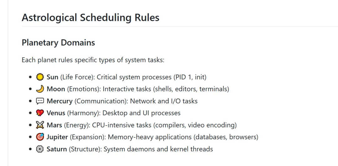 这哥们在 README 里的口气那是相当狂妄:“为什么要让凡人那些平庸的算法来决定 CPU 的优先级?从现在起,让浩瀚宇宙来指引我们。”