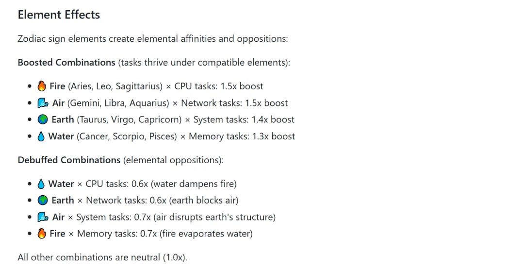 文档里还有个针对双子座的定向降智打击,简直是人身攻击。 作者算准了 2026 年 4 月 10 日那天星象对双子座极度不利,于是写死了代码:到了那天,调度器会强制把 CPU 任务执行速度砍掉 50%。