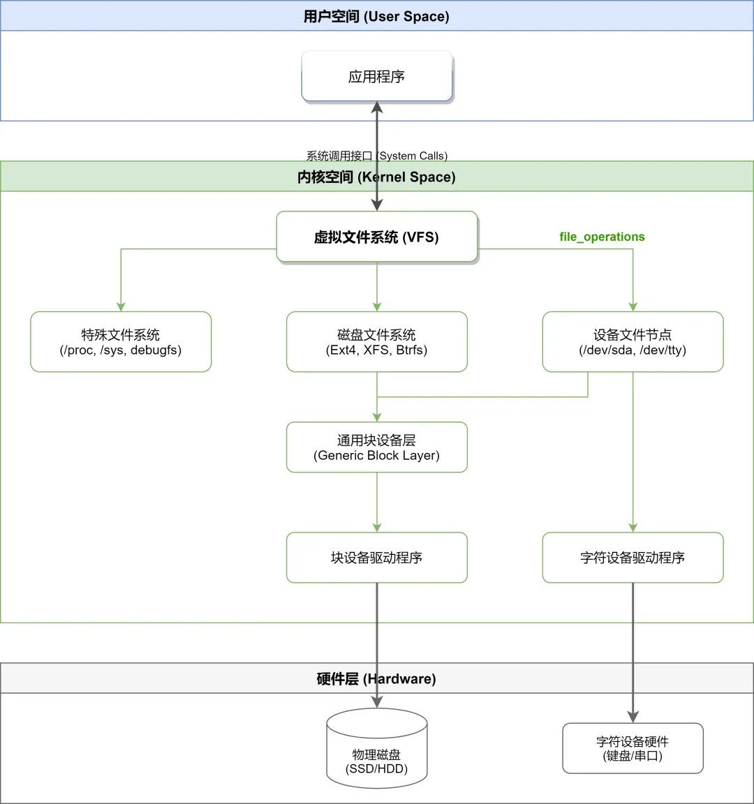 应用程序层面:应用程序不会直接操作硬件底层,也不会直接对接具体的文件系统(如ext4、xfs、proc等),而是通过统一的系统调用(如open打开文件/设备、read读取数据、write写入数据、close关闭文件/设备)与VFS进行交互;