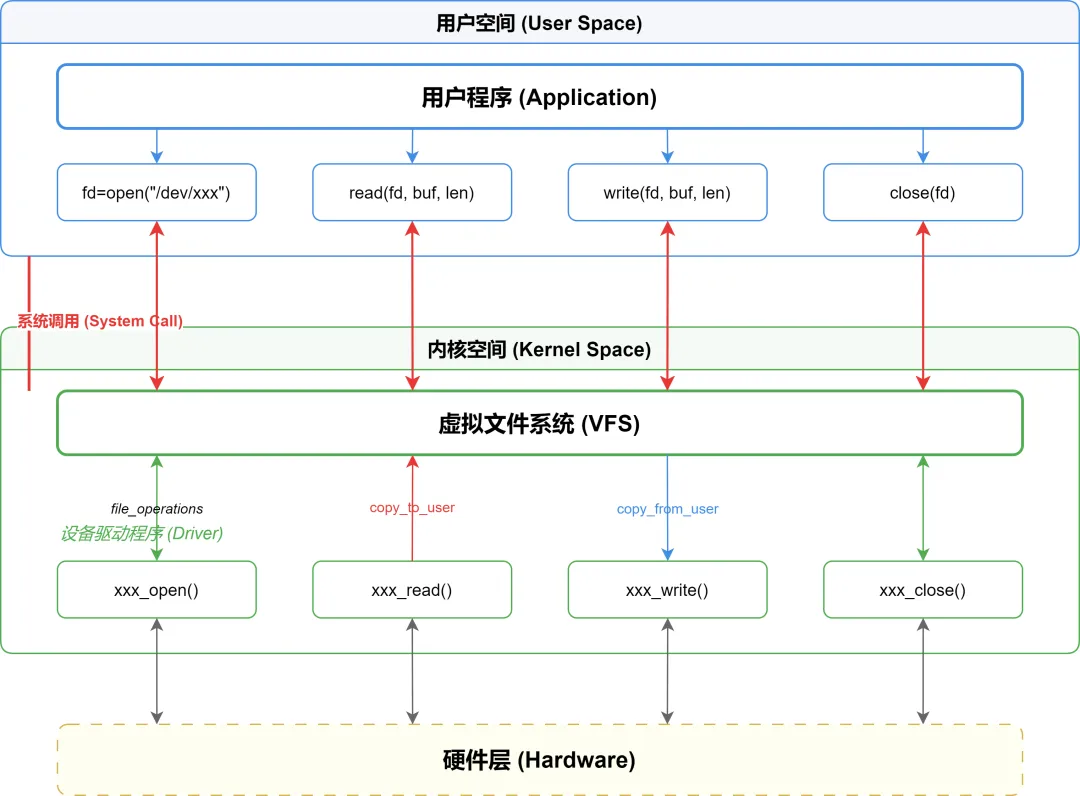 简单来说,整个交互流程可总结为:应用程序调用系统调用 → VFS接收请求并转发 → file_operations结构体调用对应的驱动函数 → 驱动程序操作硬件底层。这也正是Linux“一切皆文件”设计理念的底层逻辑——将硬件设备抽象为设备文件,通过统一的文件操作接口,实现对硬件的间接控制,降低了应用程序与驱动开发的复杂度。