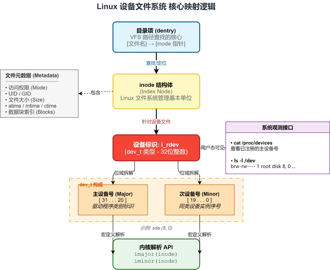 对于设备驱动开发而言,inode结构体最核心的字段是i_rdev,该字段用于存储设备编号,而设备编号是实现驱动程序与具体硬件设备关联的关键。Linux系统中的设备编号分为两部分,共同唯一标识一个设备: