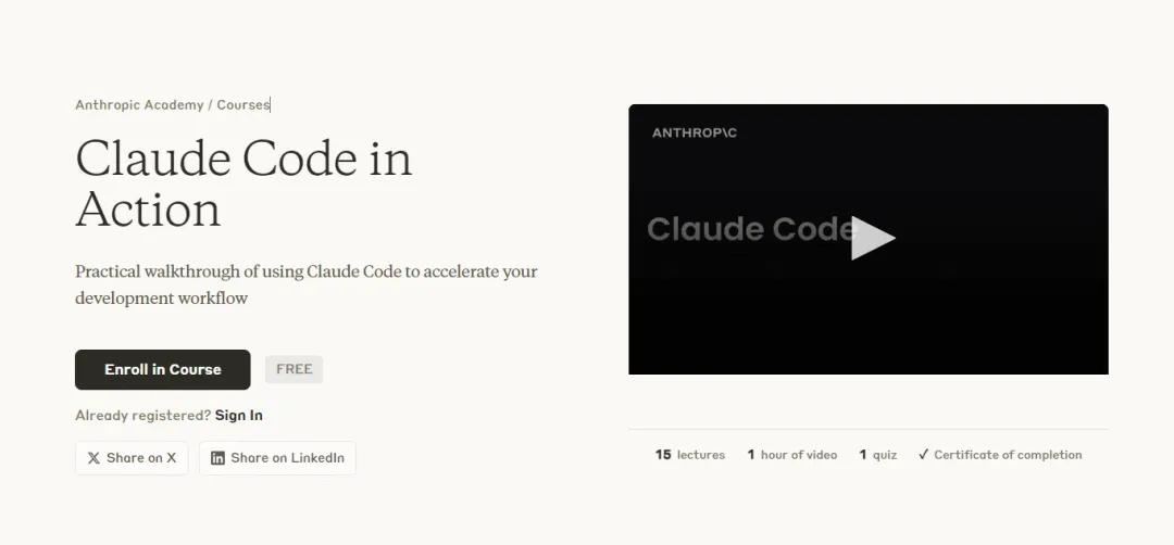 Anthropic 官方的 Claude Code 免费入门教程,一共15节视频课,总长约1小时。