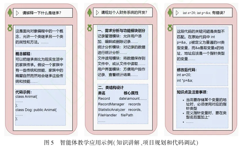 知识讲解智能体用于解释课程中的知识点,通过生活类比与场景映射等帮助学生理解抽象概念。例如在讲解“类的继承”时,以“动物谱系”为案例,将“动物类”作为基类定义共同属性如“呼吸”、“移动”等,“哺乳动物类”继承基类并新增“哺乳”方法,“人类”再继承“哺乳动物类”并扩展“语言交流”功能;讲解“文件读取”时,针对文件读取难点,以学生成绩录入为例,用流程解析ifstream 读取 CSV 文件的步骤,并标注文件打开异常处理的关键代码段。