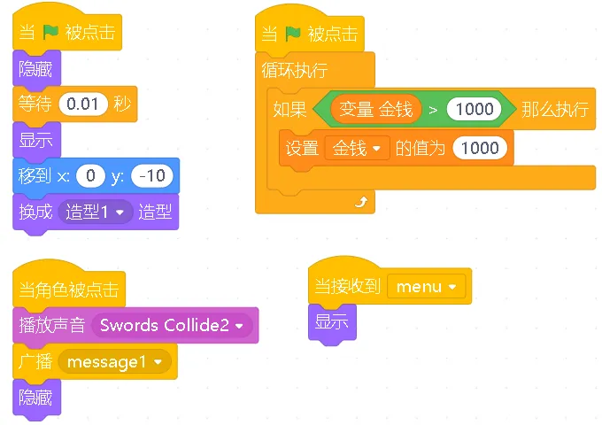 变量的使用:用变量来记录游戏状态,比如金钱、生命值等。