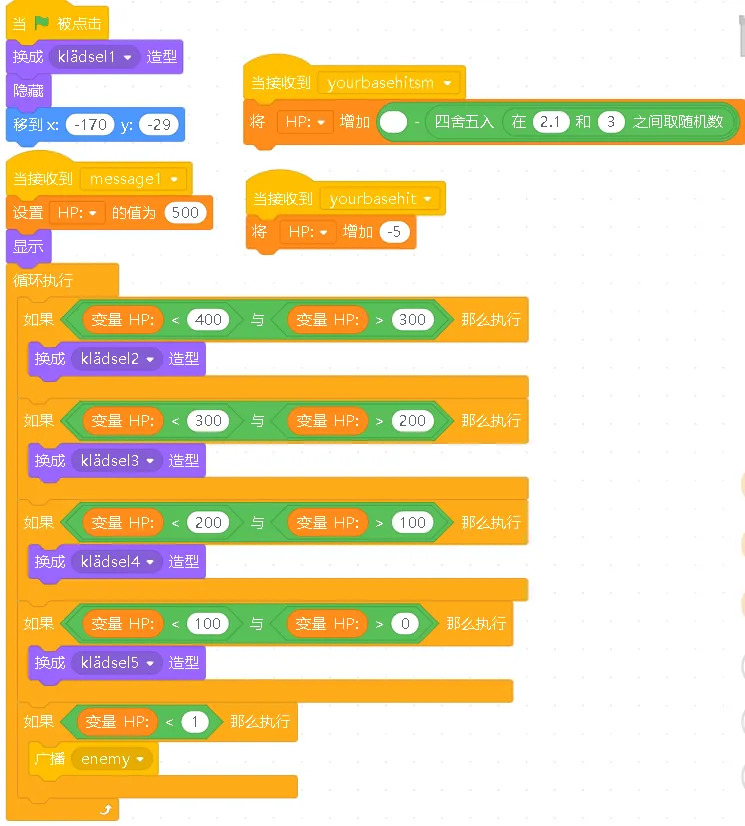 详细程序讲解:当游戏开始时,基地会显示出来,并且设置初始生命值为500。它会不断检查自己的生命值,如果生命值低于400、300、200或100,就会切换不同的造型,显示受损的状态。如果生命值降到0以下,就会广播游戏失败的消息。