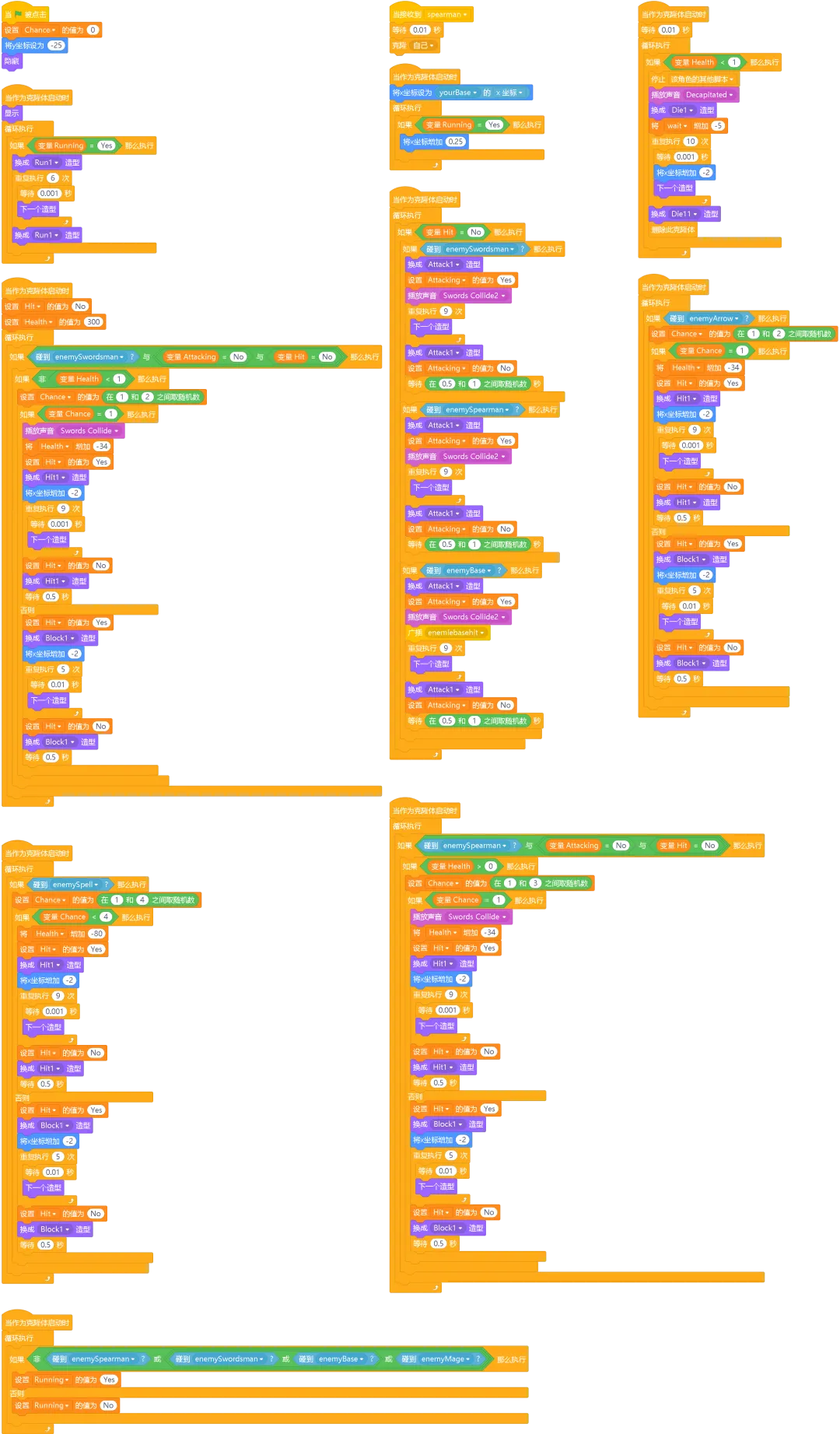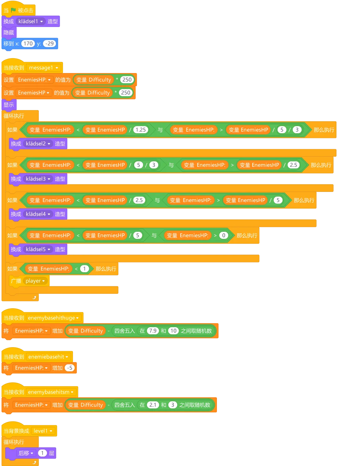舞台代码:当绿旗被点击时,舞台会初始化所有变量,设置背景,然后开始游戏。当接收到特定广播时,会处理敌人生成、金币自动增加等逻辑。
