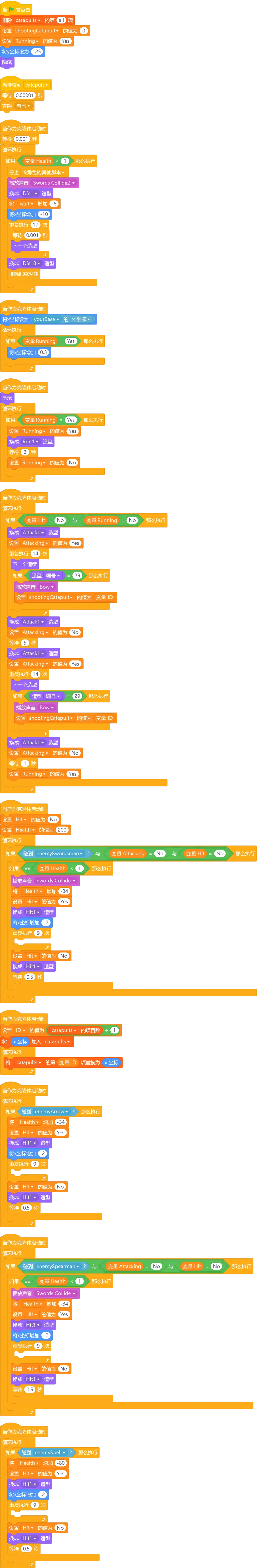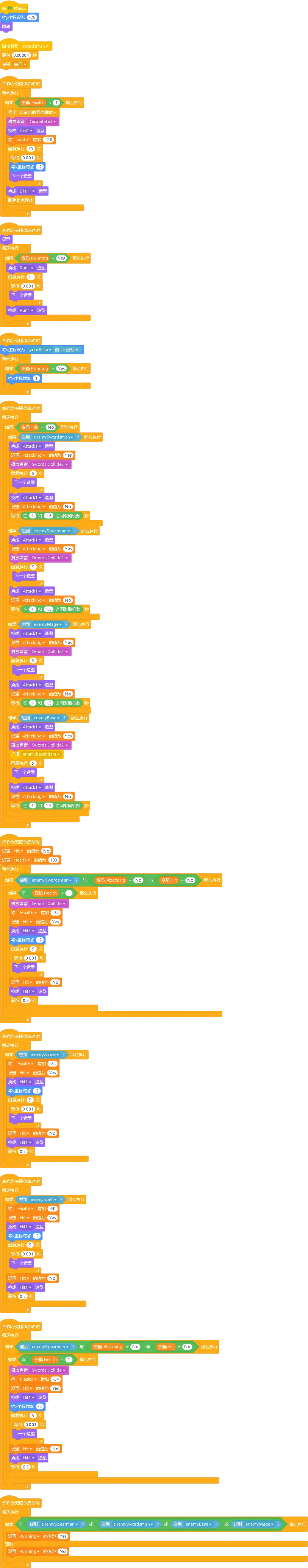 详细程序讲解:当我们购买剑士时,会克隆一个剑士角色。克隆体开始时会隐藏,然后设置初始位置和生命值。当它没有碰到敌人时,会一直向前奔跑;当碰到敌人或敌方基地时,会停下来攻击;当被敌人攻击时,会播放受伤动画,生命值减少;当生命值降到0以下时,会播放死亡动画,然后删除自己。