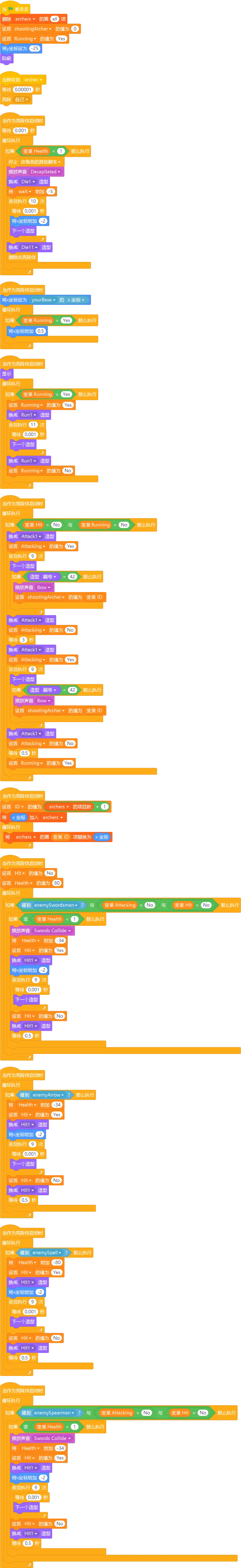 详细程序讲解:当我们购买弓箭手时,会克隆一个弓箭手角色。克隆体开始时会隐藏,然后设置初始位置和生命值。当它没有碰到敌人时,会一直向前奔跑;当跑到一定距离时,会停下来射箭攻击敌人;当被敌人攻击时,会播放受伤动画,生命值减少;当生命值降到0以下时,会播放死亡动画,然后删除自己。
