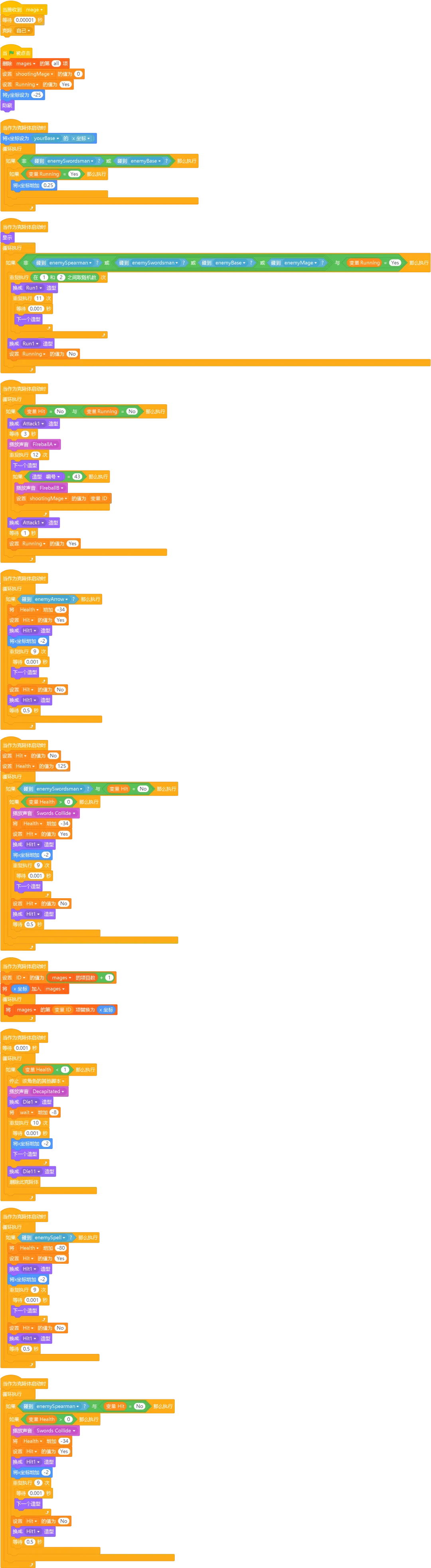 详细程序讲解:当我们购买法师时,会克隆一个法师角色。克隆体开始时会隐藏,然后设置初始位置和生命值。当它没有碰到敌人时,会一直向前奔跑;当跑到一定距离时,会停下来释放魔法攻击敌人;当被敌人攻击时,会播放受伤动画,生命值减少;当生命值降到0以下时,会播放死亡动画,然后删除自己。