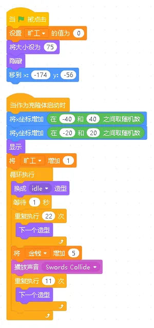 详细程序讲解:当我们购买金矿时,会克隆一个金矿角色。克隆体开始时会隐藏,然后设置在基地附近的随机位置,开始工作。它会不断地播放挖矿动画,每过一段时间就会生产5个金币,然后播放收集金币的声音。