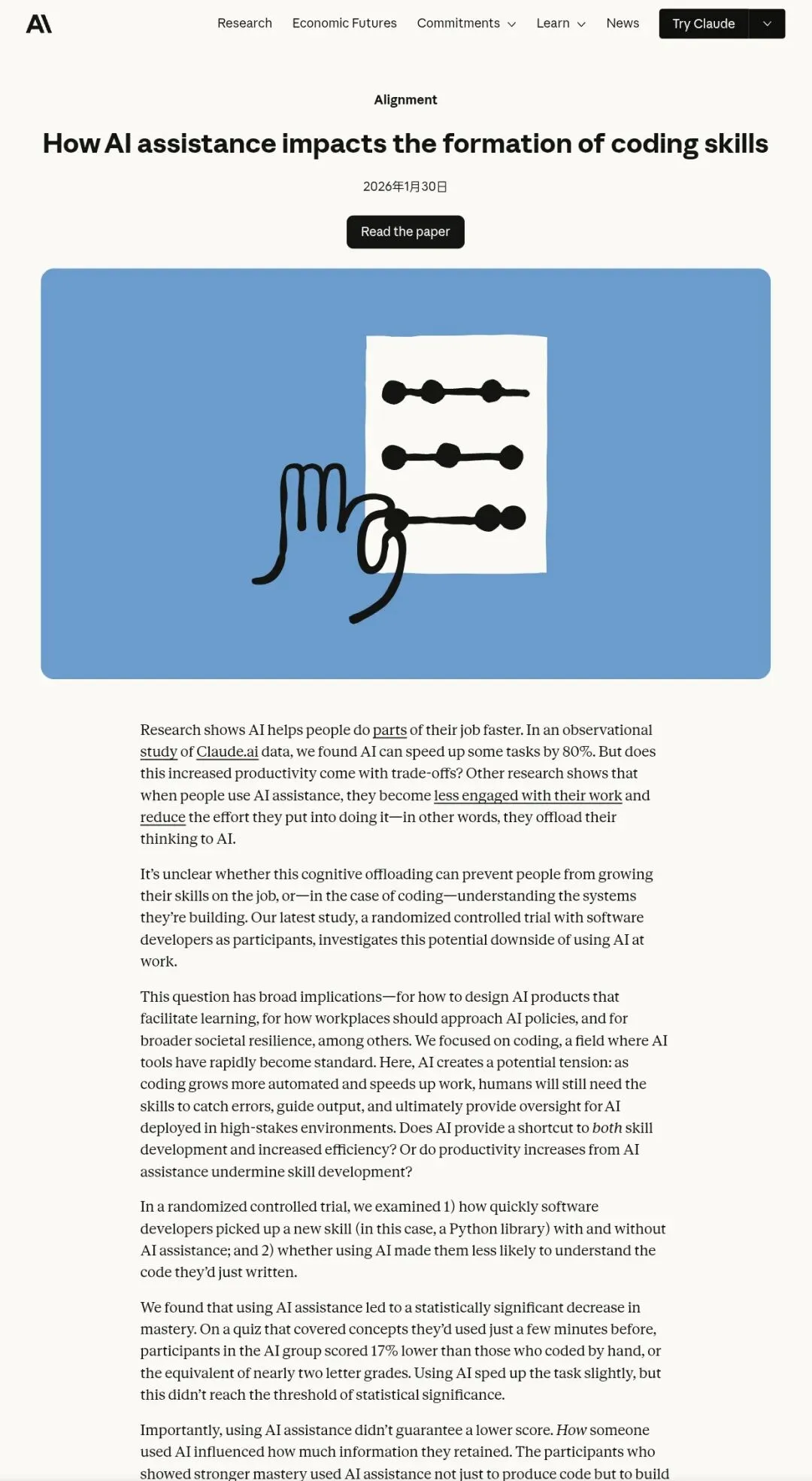 参考文献:Shen, J. H., & Tamkin, A. (2026). How AI Impacts Skill Formation. arXiv preprint arXiv:2601.20245.
