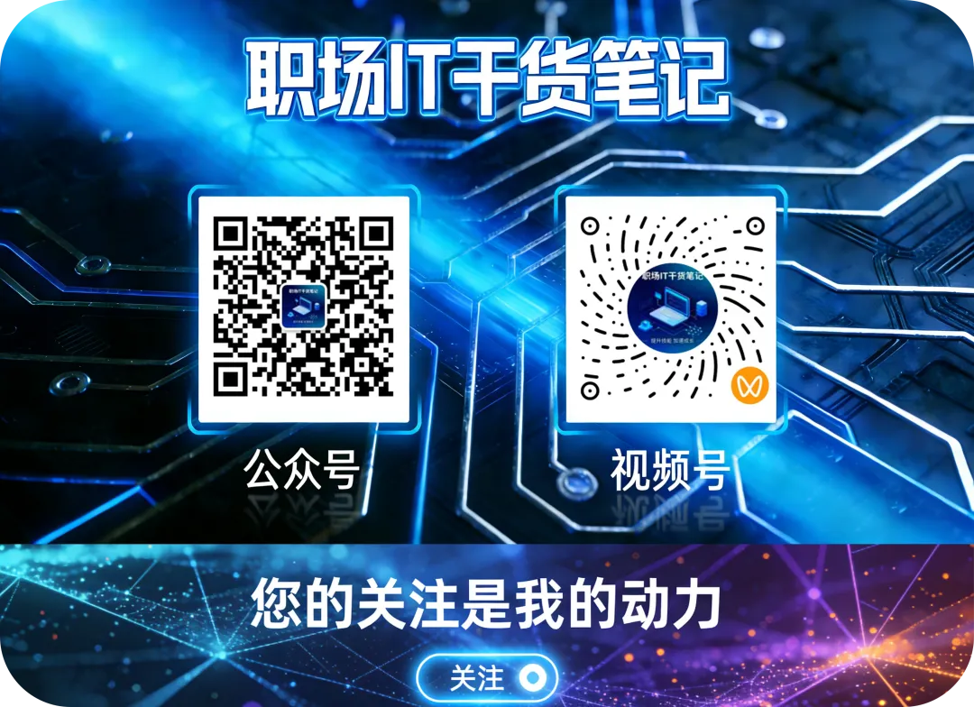 公众号「职场IT干货笔记」,我会把多年一线IT技术的实战经验,转化为职场人刚需的实用技能与硬核干货,涵盖IT常见故障排除及问题处理、IT办公技巧、工具效率、技术踩坑指南,助力职场白领和职场小白快速提升核心竞争力。每周都会不定时不间断更新硬核干货,让身在职场的你少走弯路,技术进阶不迷路~
