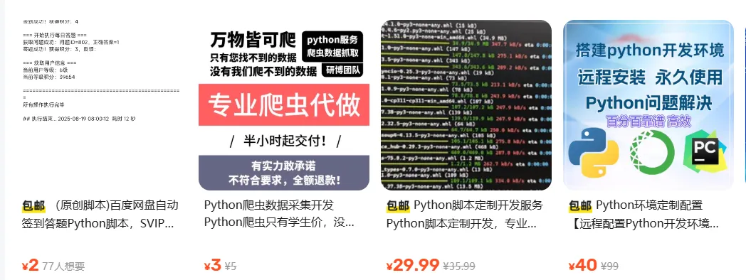 这个项目适合有Python基础的上班族、学生党,哪怕是刚入门的新手,花1-2周补补基础也能上手;变现周期很短,上架商品后3-7天就能接到第一单,积累好评后订单会越来越稳定;预期变现方面,新手每月2000-5000元,熟练后深耕细分场景,月入8000+不难,而且技术越练越熟练,后期还能拓展企业定制服务,溢价空间更大。