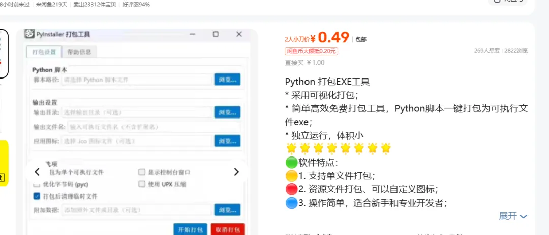 做这个项目不用追求高深技术,掌握基础的Python语法,能编写简单脚本、打包成可直接使用的EXE文件就足够。我刚开始做的时候,就是从最简单的小工具入手,比如帮财务定制工资条批量生成工具,帮电商卖家做商品信息批量整理脚本,单价定在80-300元不等。上架商品时,重点标注具体使用场景,配上简单的操作演示视频,曝光量比单纯写“Python定制”高很多,初期可以低价接小单攒好评,有10个以上好评后再逐步提价。