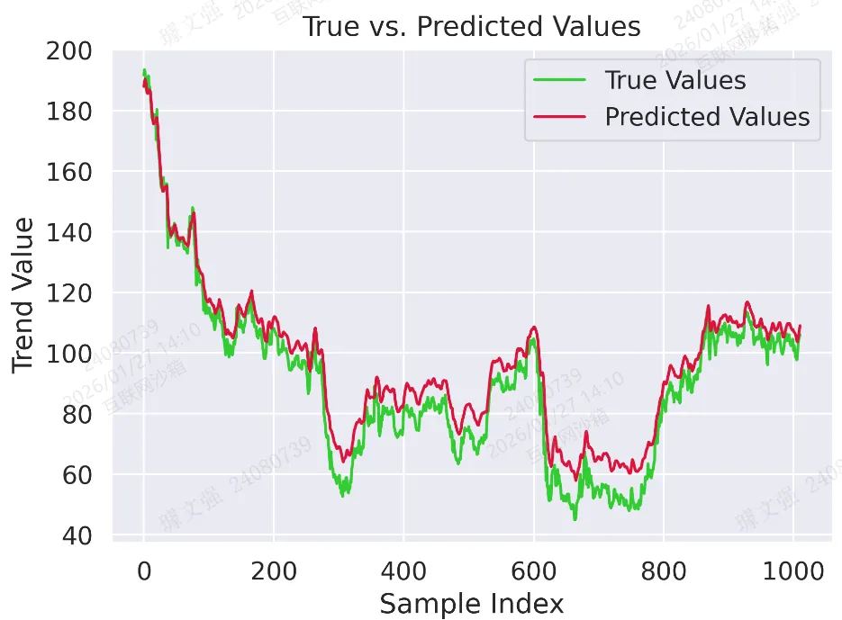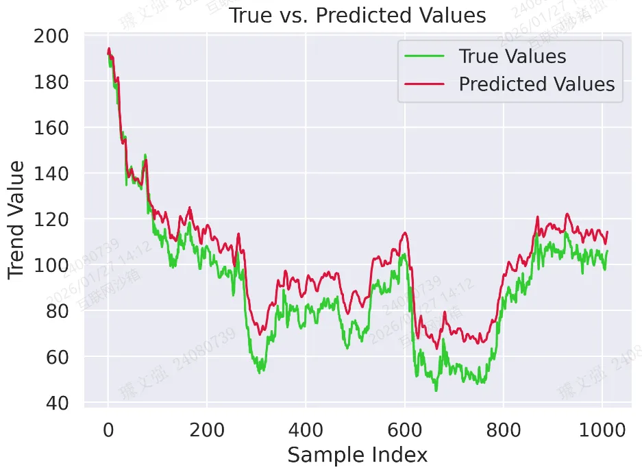 plt.plot(trues, label="True Values", color='limegreen')plt.plot(final_preds, label="Predicted Values", color='crimson')plt.title("True vs. Predicted Values")plt.xlabel("Sample Index")plt.ylabel("Trend Value")plt.legend()plt.tight_layout()plt.savefig('output_image3.png', dpi=300, format='png')plt.show()
