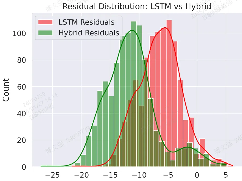 sns.histplot(trues - preds, color='red', label='LSTM Residuals', kde=True)sns.histplot(trues - final_preds, color='green', label='Hybrid Residuals', kde=True)plt.title("Residual Distribution: LSTM vs Hybrid")plt.legend()plt.tight_layout()plt.savefig('output_image4.png', dpi=300, format='png')plt.show()
