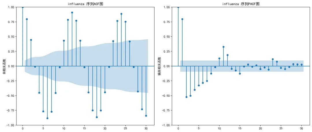 # 尝试其他阶数for q in range(2, max_q + 1): try: model = ARIMA(ts_data, order=(0, 0, q)).fit() current_aic = model.aicif current_aic < best_aic - 2: # AIC改进至少2个单位 best_aic = current_aic best_model = model best_q = q except Exception as e:continue# 忽略错误,继续尝试下一个qif best_model is None:# 如果所有尝试都失败,使用均值模型作为回退print("所有MA模型拟合失败,使用均值模型") mean_val = np.mean(ts_data)# 创建一个简单的类来模拟模型对象 class MeanModel: def __init__(self, mean_val, residuals): self.aic = np.nan self.bic = np.nan self.resid = residuals self.params = [mean_val] self.fittedvalues = np.full_like(residuals, mean_val) def forecast(self, steps):return np.full(steps, self.params[0]) def predict(self, start, end):return np.full(end - start, self.params[0]) best_model = MeanModel(mean_val, ts_data - mean_val) best_q = 0return {'model': best_model,'q': best_q,'aic': best_aic if hasattr(best_model, 'aic') else np.nan } def create_acf_pacf_plots(self, ts_data, disease, is_diff=False):"""生成ACF和PACF图""" try: fig, (ax1, ax2) = plt.subplots(1, 2, figsize=(14, 6))# ACF图 plot_acf(ts_data, ax=ax1, lags=30) title_suffix = "差分后"if is_diff else"" ax1.set_title(f'{disease} {title_suffix}序列ACF图') ax1.set_ylabel('自相关函数')# PACF图 plot_pacf(ts_data, ax=ax2, lags=30) ax2.set_title(f'{disease} {title_suffix}序列PACF图') ax2.set_ylabel('偏自相关函数') plt.tight_layout()# 保存图形 suffix = "_diff"if is_diff else"" plot_path = os.path.join(self.results_path, "ACF_PACF_Plots", f"ACF_PACF_{disease}{suffix}.png") plt.savefig(plot_path, dpi=200, bbox_inches='tight') plt.close()return fig except Exception as e:print(f"创建ACF/PACF图时出错: {e}")return None