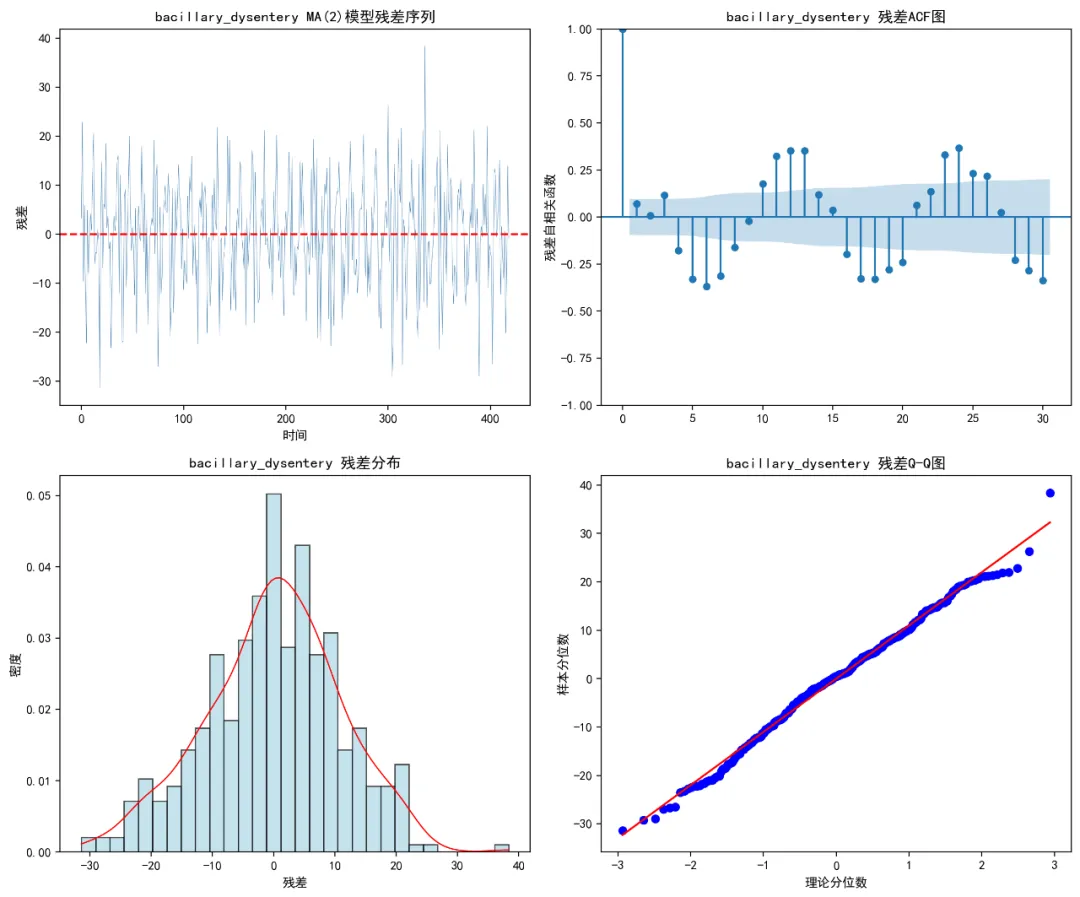 def create_residual_plots(self, model, disease, q):"""生成残差诊断图""" try:if hasattr(model, 'resid'): residuals = model.residelse: residuals = np.array([0]) # 回退情况 fig, ((ax1, ax2), (ax3, ax4)) = plt.subplots(2, 2, figsize=(12, 10))# 残差时间序列图 ax1.plot(residuals, color='steelblue', linewidth=0.3) ax1.axhline(y=0, linestyle='--', color='red') ax1.set_title(f'{disease} MA({q})模型残差序列') ax1.set_xlabel('时间') ax1.set_ylabel('残差')# 残差ACF图 plot_acf(residuals, ax=ax2, lags=30) ax2.set_title(f'{disease} 残差ACF图') ax2.set_ylabel('残差自相关函数')# 残差直方图 ax3.hist(residuals, bins=30, density=True, alpha=0.7, color='lightblue', edgecolor='black') ax3.set_title(f'{disease} 残差分布') ax3.set_xlabel('残差') ax3.set_ylabel('密度')# 添加密度曲线 try: from scipy.stats import gaussian_kde kde = gaussian_kde(residuals) x_range = np.linspace(residuals.min(), residuals.max(), 100) ax3.plot(x_range, kde(x_range), color='red', linewidth=1) except: pass# Q-Q图 stats.probplot(residuals, dist="norm", plot=ax4) ax4.set_title(f'{disease} 残差Q-Q图') ax4.set_xlabel('理论分位数') ax4.set_ylabel('样本分位数') plt.tight_layout()# 保存图形 plot_path = os.path.join(self.results_path, "Residual_Plots", f"Residuals_{disease}.png") plt.savefig(plot_path, dpi=200, bbox_inches='tight') plt.close()return fig except Exception as e:print(f"创建残差图时出错: {e}")return None