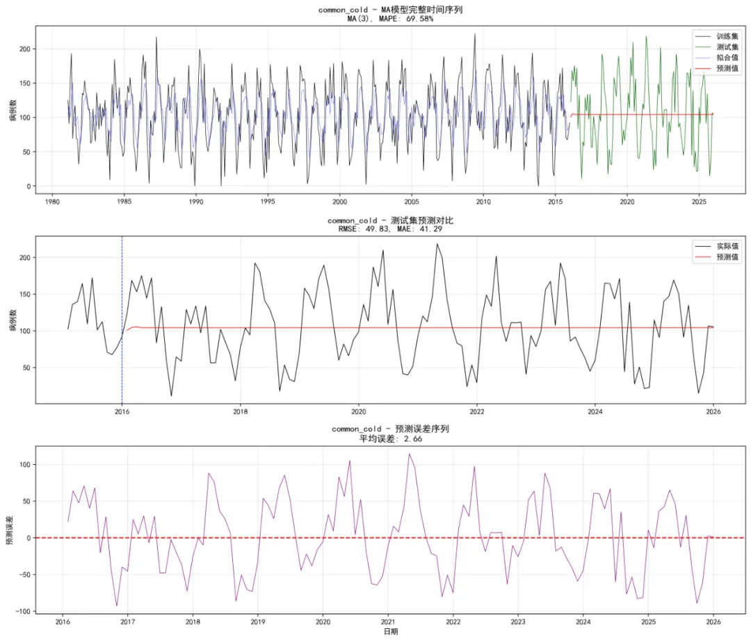 def safe_forecast(self, model, h, last_value=None):"""安全预测函数""" try:if hasattr(model, 'forecast'): forecast_result = model.forecast(steps=h)# 简化处理,实际应用中需要更复杂的置信区间计算 forecast_mean = forecast_resultif hasattr(model, 'resid'): resid_std = np.std(model.resid) forecast_lower = forecast_mean - 1.96 * resid_std forecast_upper = forecast_mean + 1.96 * resid_stdelse: forecast_lower = forecast_mean forecast_upper = forecast_meanelse:# 均值模型预测 mean_val = model.params[0] if hasattr(model, 'params') else last_value forecast_mean = np.full(h, mean_val) forecast_lower = np.full(h, mean_val) forecast_upper = np.full(h, mean_val)return {'mean': forecast_mean,'lower': np.column_stack([forecast_lower, forecast_lower]),'upper': np.column_stack([forecast_upper, forecast_upper]) } except Exception as e:print(f"预测失败: {e}") forecast_value = last_value if last_value is not None else 0return {'mean': np.full(h, forecast_value),'lower': np.full((h, 2), forecast_value),'upper': np.full((h, 2), forecast_value) } def calculate_metrics(self, actual, forecast):"""计算评估指标"""if len(actual) == 0 or len(forecast) == 0:return {'rmse': np.nan, 'mae': np.nan, 'mape': np.nan}# 确保长度一致 min_len = min(len(actual), len(forecast)) actual = actual[:min_len] forecast = forecast[:min_len]# 移除NaN值 mask = ~(np.isnan(actual) | np.isnan(forecast)) actual = actual[mask] forecast = forecast[mask]if len(actual) == 0:return {'rmse': np.nan, 'mae': np.nan, 'mape': np.nan} rmse = np.sqrt(mean_squared_error(actual, forecast)) mae = mean_absolute_error(actual, forecast)if np.mean(actual) > 0: mape = np.mean(np.abs((actual - forecast) / actual)) * 100else: mape = np.nanreturn {'rmse': rmse, 'mae': mae, 'mape': mape} def create_forecast_plots(self, disease, train_ts, test_ts, ma_model, ma_forecast, optimal_q, test_metrics):"""生成预测对比图""" try: fig, (ax1, ax2, ax3) = plt.subplots(3, 1, figsize=(14, 12))# 1. 完整序列图 train_dates = self.train_data['timestamp'].values test_dates = self.test_data['timestamp'].values# 获取拟合值if hasattr(ma_model, 'fittedvalues'): fitted_values = ma_model.fittedvalueselse: fitted_values = train_ts - (ma_model.resid if hasattr(ma_model, 'resid') else 0)# 完整序列 ax1.plot(train_dates, train_ts, color='black', linewidth=0.6, label='训练集') ax1.plot(test_dates, test_ts, color='darkgreen', linewidth=0.6, label='测试集') ax1.plot(train_dates, fitted_values, color='blue', linewidth=0.4, alpha=0.7, label='拟合值') ax1.plot(test_dates, ma_forecast['mean'], color='red', linewidth=0.8, label='预测值') mape_display = f"{test_metrics['mape']:.2f}"if not np.isnan(test_metrics['mape']) else"NA" ax1.set_title(f'{disease} - MA模型完整时间序列\nMA({optimal_q}), MAPE: {mape_display}%') ax1.set_ylabel('病例数') ax1.legend() ax1.grid(True, alpha=0.3)# 2. 测试集详细图# 选择最近的数据(2015年以后的训练数据和所有测试数据) train_recent_mask = self.train_data['timestamp'] >= '2015-01-01' recent_train_dates = self.train_data[train_recent_mask]['timestamp'].values recent_train_values = self.train_data[train_recent_mask][disease].values recent_dates = np.concatenate([recent_train_dates, test_dates]) recent_actual = np.concatenate([recent_train_values, test_ts])# 创建对应的预测值数组(训练部分为NaN) recent_forecast = np.concatenate([ np.full(len(recent_train_dates), np.nan), ma_forecast['mean'] ]) ax2.plot(recent_dates, recent_actual, color='black', linewidth=0.8, label='实际值') ax2.plot(recent_dates, recent_forecast, color='red', linewidth=0.8, label='预测值') ax2.axvline(x=pd.Timestamp('2016-01-01'), linestyle='--', color='blue', linewidth=0.8) rmse_display = f"{test_metrics['rmse']:.2f}"if not np.isnan(test_metrics['rmse']) else"NA" mae_display = f"{test_metrics['mae']:.2f}"if not np.isnan(test_metrics['mae']) else"NA" ax2.set_title(f'{disease} - 测试集预测对比\nRMSE: {rmse_display}, MAE: {mae_display}') ax2.set_ylabel('病例数') ax2.legend() ax2.grid(True, alpha=0.3)# 3. 预测误差图 error_data = test_ts[:len(ma_forecast['mean'])] - ma_forecast['mean']if len(error_data) > 0: ax3.plot(test_dates[:len(error_data)], error_data, color='purple', linewidth=0.6) ax3.axhline(y=0, linestyle='--', color='red') mean_error = np.mean(error_data) if len(error_data) > 0 else 0 ax3.set_title(f'{disease} - 预测误差序列\n平均误差: {mean_error:.2f}') ax3.set_xlabel('日期') ax3.set_ylabel('预测误差') ax3.grid(True, alpha=0.3)else: ax3.text(0.5, 0.5, '无预测数据', transform=ax3.transAxes, ha='center', va='center', fontsize=12) ax3.set_title(f'{disease} - 无预测数据') plt.tight_layout()# 保存图形 plot_path = os.path.join(self.results_path, "Plots", f"Forecast_Comparison_{disease}.png") plt.savefig(plot_path, dpi=200, bbox_inches='tight') plt.close()return fig except Exception as e:print(f"创建预测图时出错: {e}")return None