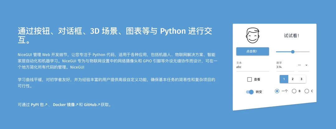 如果你曾经被“做个界面”难住,或者厌倦了在前端配置里挣扎,NiceGUI 绝对值得你花半小时体验一下。从数据科学展示、物联网控制面板,到内部工具和小脚本,它都能让想法更快地变成可交互的现实。