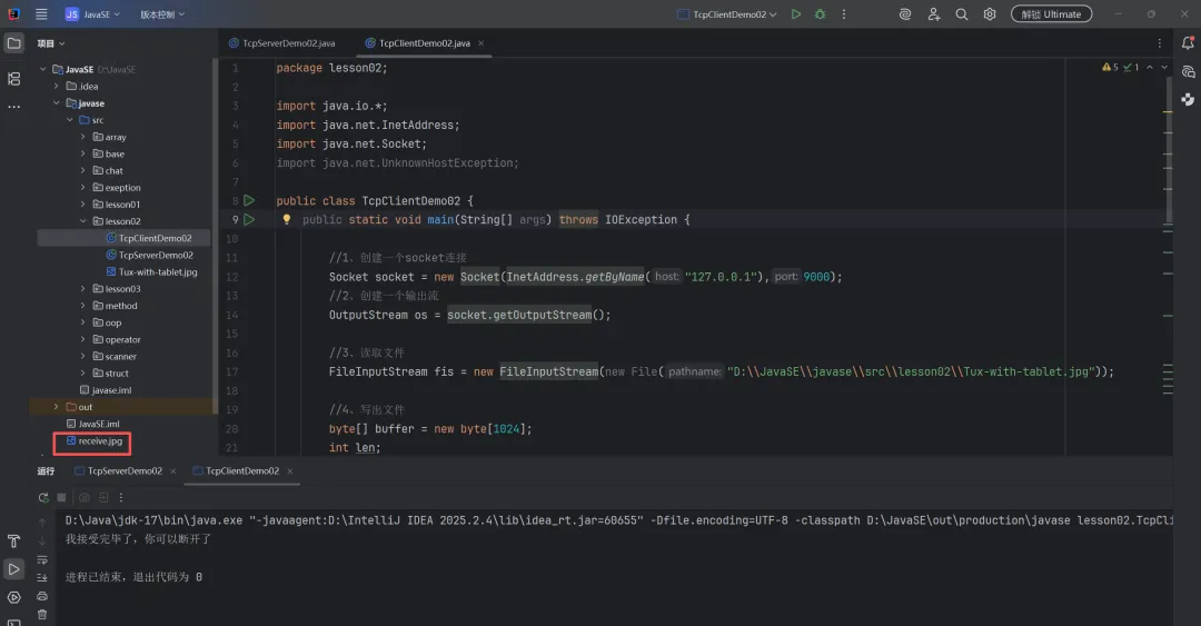 package lesson02;import java.io.*;import java.net.InetAddress;import java.net.Socket;import java.net.UnknownHostException;public class TcpClientDemo02 { public static void main(String[] args) throws IOException { //1、创建一个socket连接 Socket socket = new Socket(InetAddress.getByName("127.0.0.1"),9000); //2、创建一个输出流 OutputStream os = socket.getOutputStream(); //3、读取文件 FileInputStream fis = new FileInputStream(new File("D:\\JavaSE\\javase\\src\\lesson02\\Tux-with-tablet.jpg")); //4、写出文件 byte[] buffer = new byte[1024]; int len; while ((len = fis.read(buffer)) != -1) { os.write(buffer, 0, len); } //通知服务器,我已经结束了 socket.shutdownOutput(); //我已经传输完了! //确定服务器接收完毕,才能断开连接 InputStream inputStream = socket.getInputStream(); //String byte[] ByteArrayOutputStream baos = new ByteArrayOutputStream(); byte[] buffer2 = new byte[2024]; int len2; while ((len2 = inputStream.read(buffer2)) != -1) { baos.write(buffer2, 0, len2); } System.out.println(baos.toString()); //5、关闭资源 baos.close(); inputStream.close(); fis.close(); os.close(); socket.close(); }}