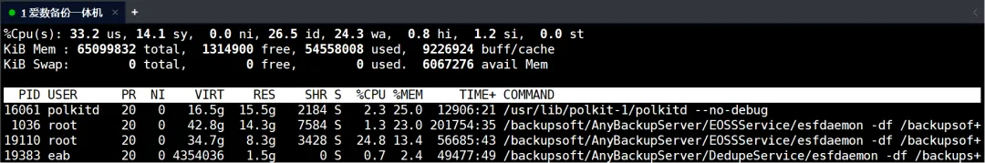 更糟的是,这台服务器还跑着 AnyBackup 备份服务(esfdaemon),本身就需要 14GB 内存。两个"内存大户"叠加,系统已处于崩溃边缘。