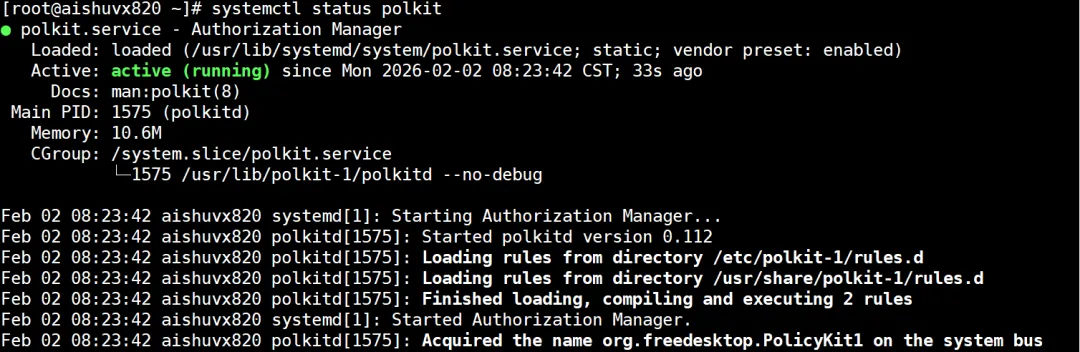 # 内存应降至 30MB 以下(正常范围)systemctl status polkit# 重点关注:Memory 字段