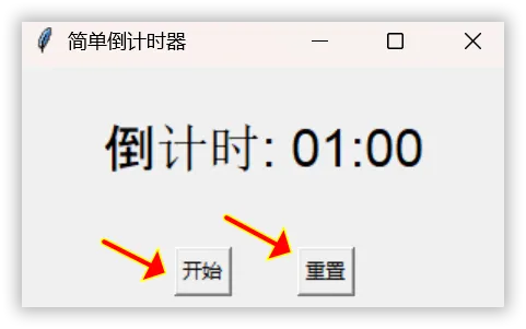 本项目将打造一款Python GUI倒计时器,最终实现倒计时、开始/暂停/继续/重置功能,倒计时结束自动提示“时间到!”。
