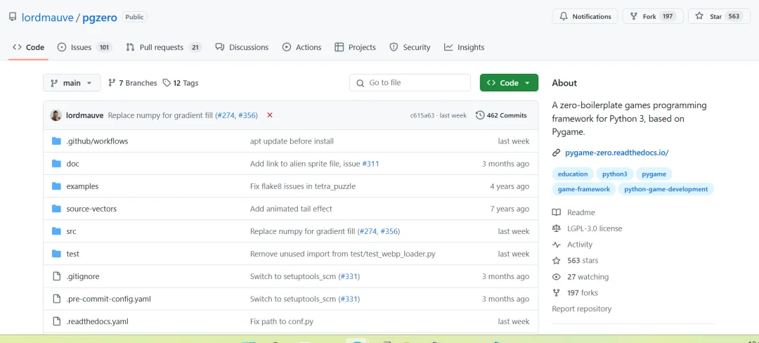 项目5:pygame-zero——零门槛游戏开发GitHub 地址:https://github.com/lordmauve/pgzero想把Python当做游戏引擎?pygame-zero极简API让你几行代码就能实现图片渲染、键鼠交互: