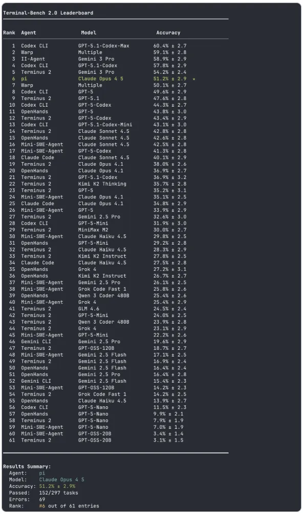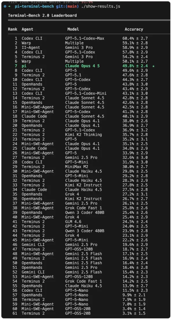我确实经常夸大其词,但我有数据证明我上面说的那些看似反常的理论真的有效吗?我有自己的亲身经历,但这很难用一篇博客文章来概括,你只能相信我。所以我用 Claude Opus 4.5 为树莓派创建了一个Terminal-Bench 2.0测试环境,并让它与 Codex、Cursor、Windsurf 和其他一些使用各自原生模型的编程工具进行对比。当然,我们都知道基准测试并不能代表实际性能,但这已经是我能提供的最佳证明,至少可以证明我说的并非全是胡说八道。