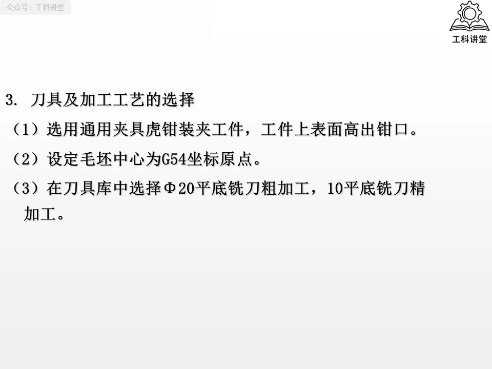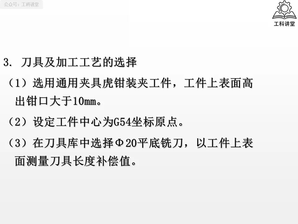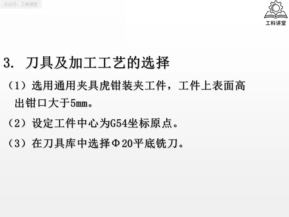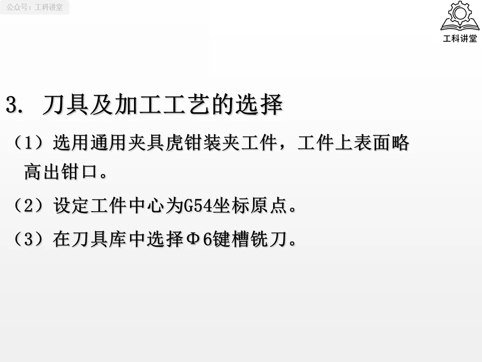 用虎钳装夹工件,上表面高出钳口,设定工件中心为 G54 原点,选 Φ6 键槽铣刀。
