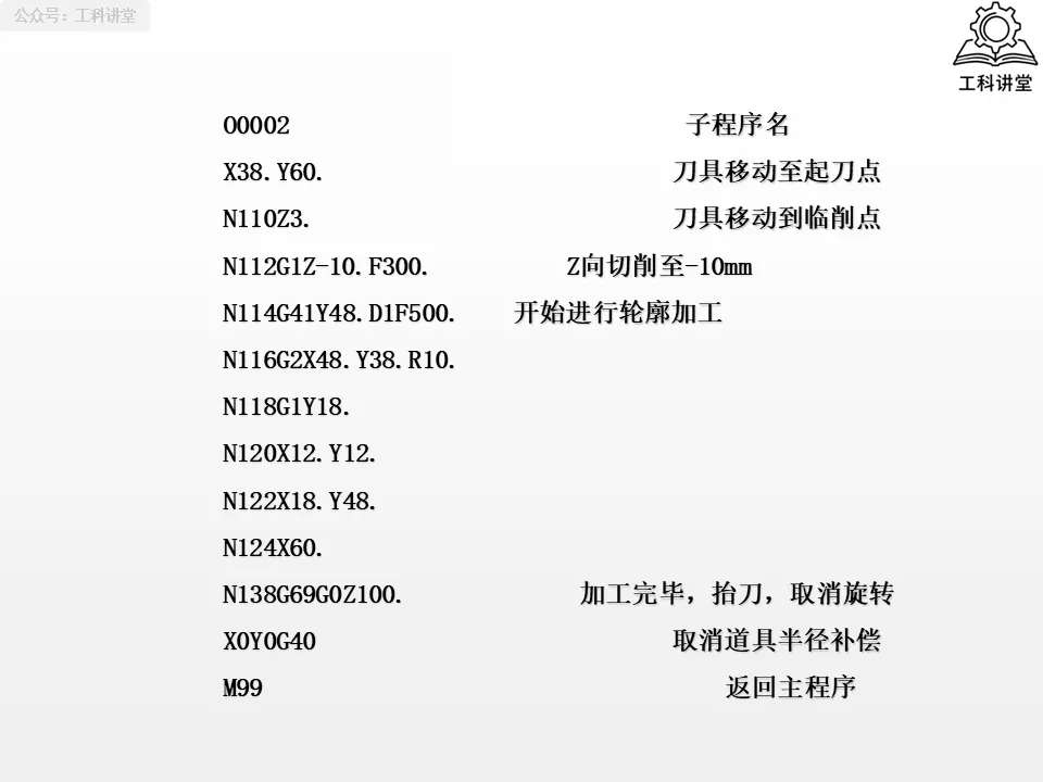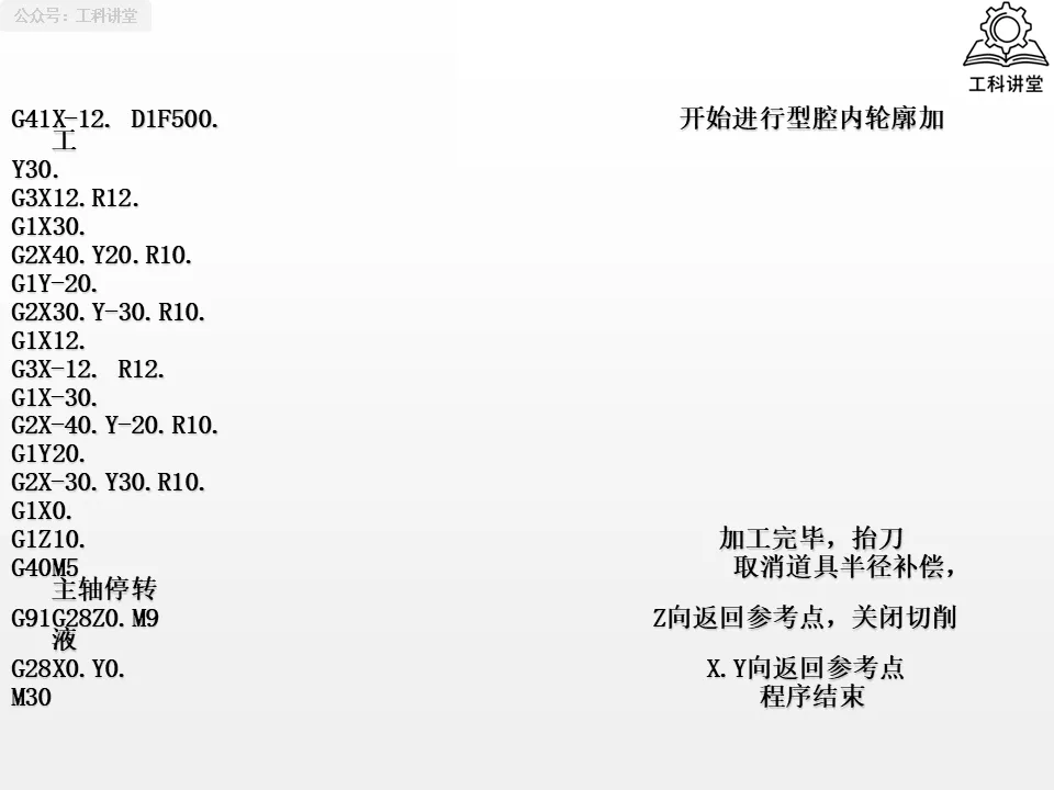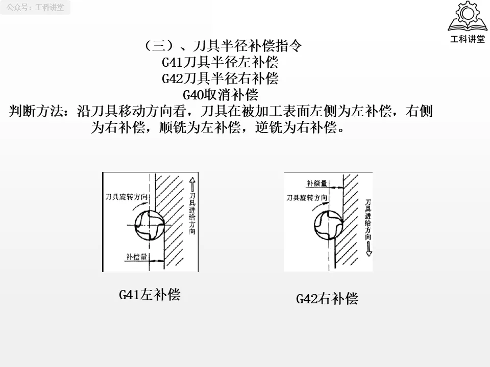 刀具补偿是编程的 “灵魂”,能帮我们抵消刀具半径和长度带来的误差。G41、G42 分别是刀具半径左右补偿,沿着刀具前进方向看,刀具在零件左侧就是 G41,右侧就是 G42;G43 是刀具长度正向补偿,装上新刀具后,只需在机床里输入长度补偿值,不用修改程序里的 Z 轴坐标。