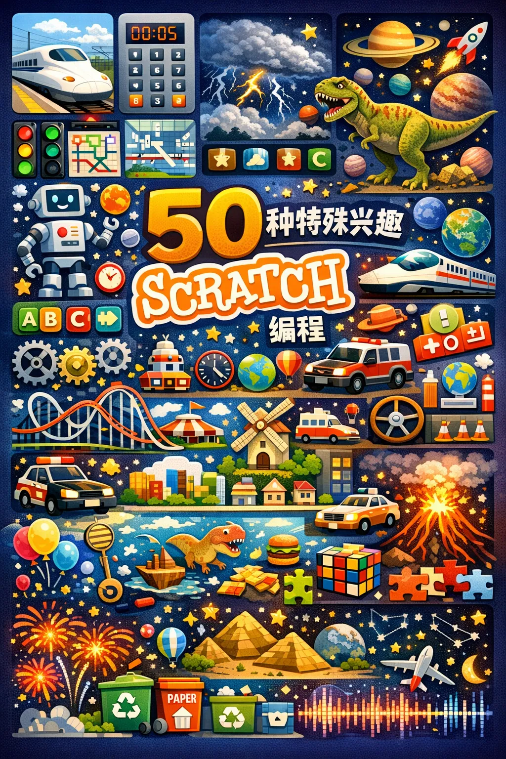 今年寒假,我们推出“兴趣导航编程”特别计划,将孩子最爱的50种特殊兴趣,转化为Scratch编程的创意起点: