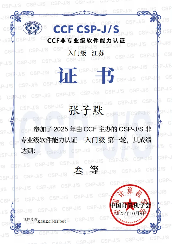 与此同时,在江苏省“信息与未来”小学生编程思维展示活动中,我校陈帅凯同学凭借扎实的编程功底与出色的逻辑思维,斩获市级一等奖;在全国青少年信息学奥林匹克联赛(CSP-J/S)中,多位同学也凭借稳定发挥荣获二等奖、三等奖,全方位展现了我校编程特色教育的深厚积淀与丰硕成果!
