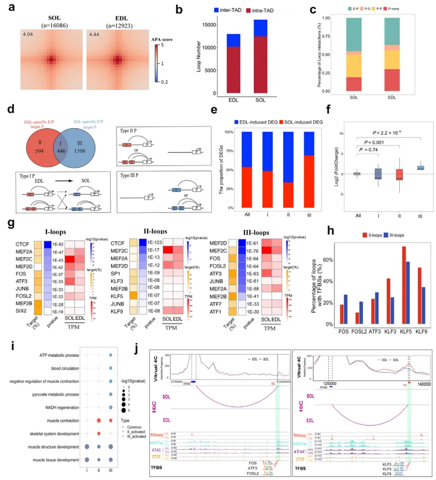 这是本研究的亮点之一。通过染色质环(loop)调用,发现E-P互作是数量最多的环类型,且与基因激活关系最密切。- E-P重编程与基因表达:研究人员根据E-P互作模式将基因分为三组:SOL特异性互作(Group III)、EDL特异性互作(Group II)和共同互作(Group I)。结果表明,具有组织特异性E-P互作的基因,其表达也呈现相应的特异性。例如,慢肌肌钙蛋白TNNI1与SOL特异性增强子互作,而快肌肌钙蛋白TNNI2与EDL特异性增强子互作。
