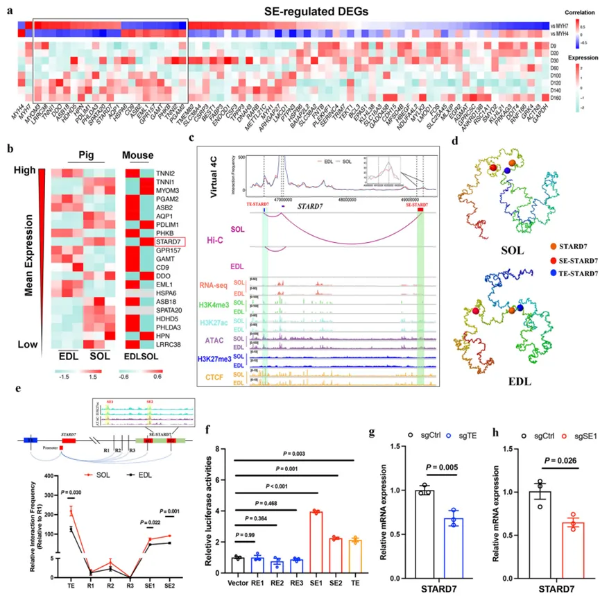 这是本研究最具突破性的发现,将3D基因组调控与肌纤维转化的生理功能直接联系起来。- STARD7的发现与验证:通过分析SE锚定基因在肌肉发育中的表达相关性,研究人员筛选出STARD7作为一个关键的候选基因。STARD7表达与MYH7正相关,与MYH4负相关。一个远端SE(SE-STARD7)通过环化作用激活STARD7的表达。