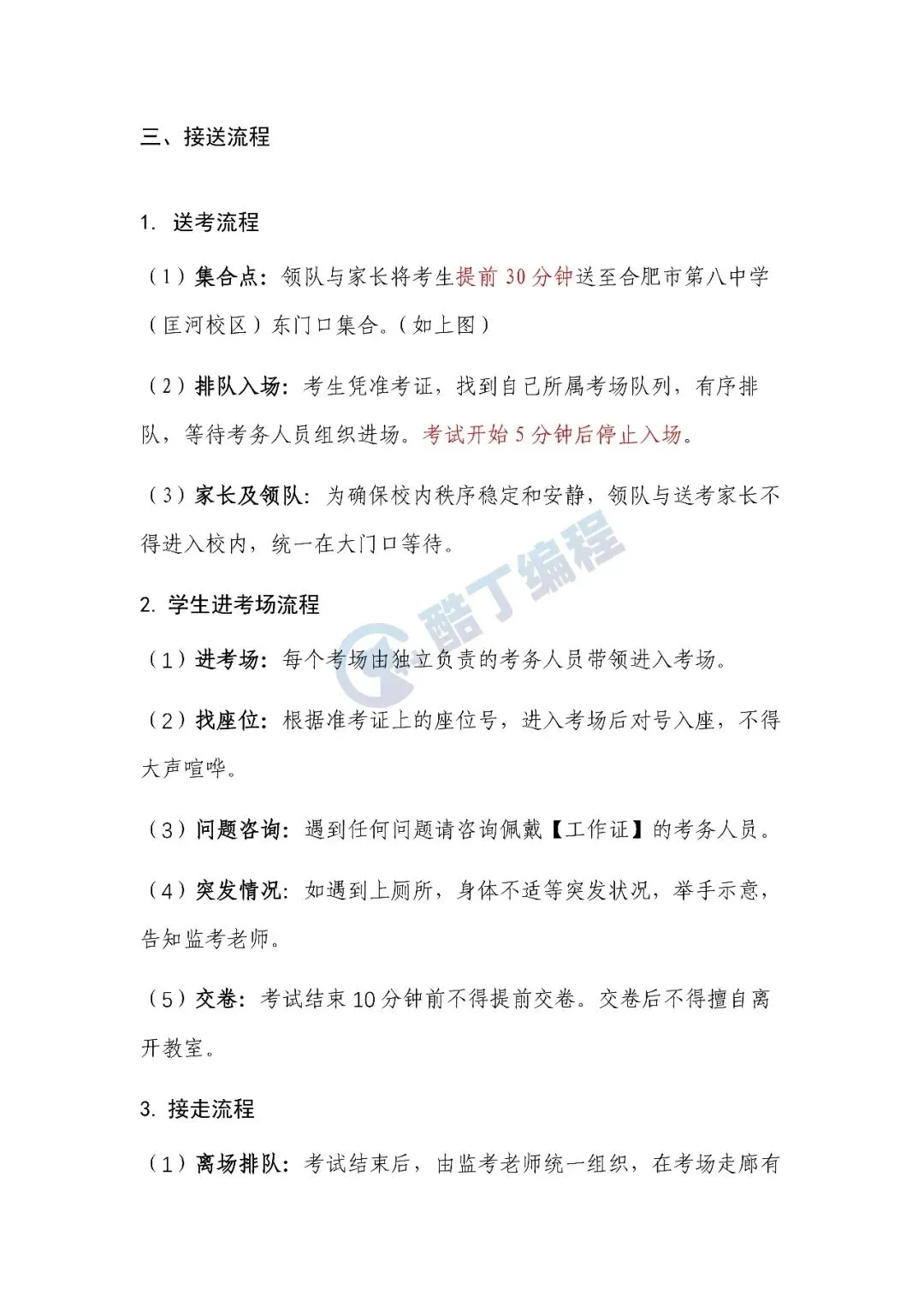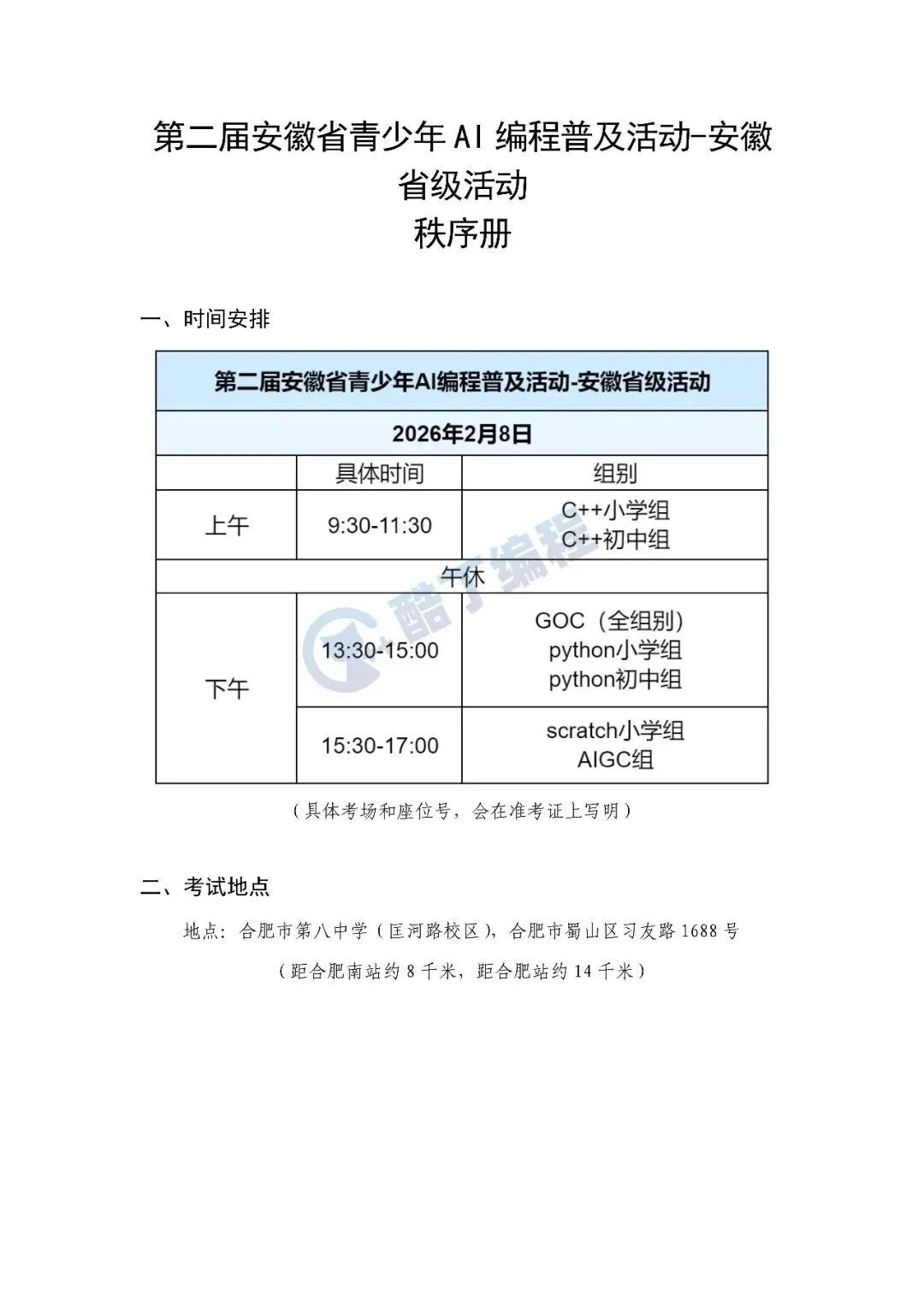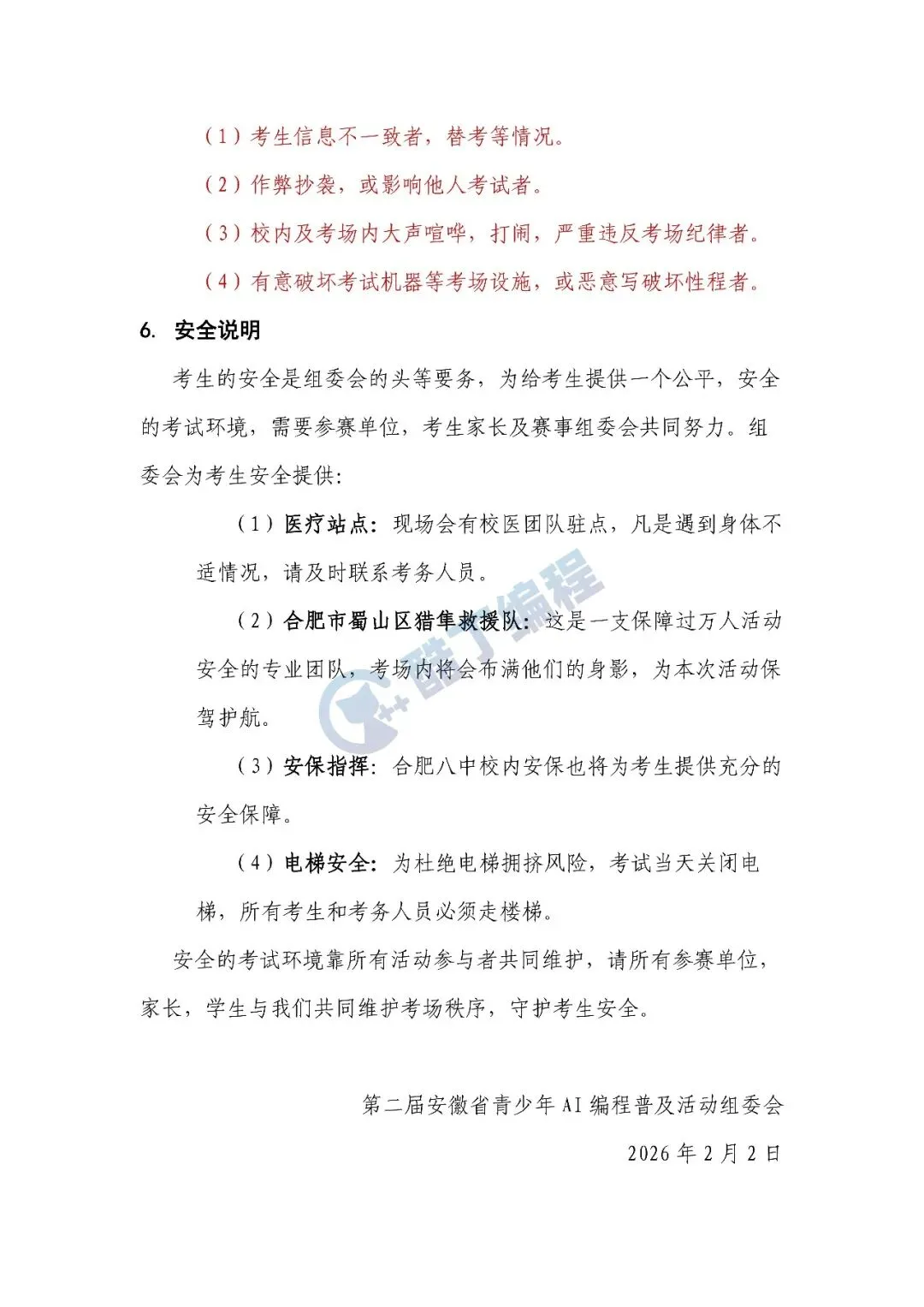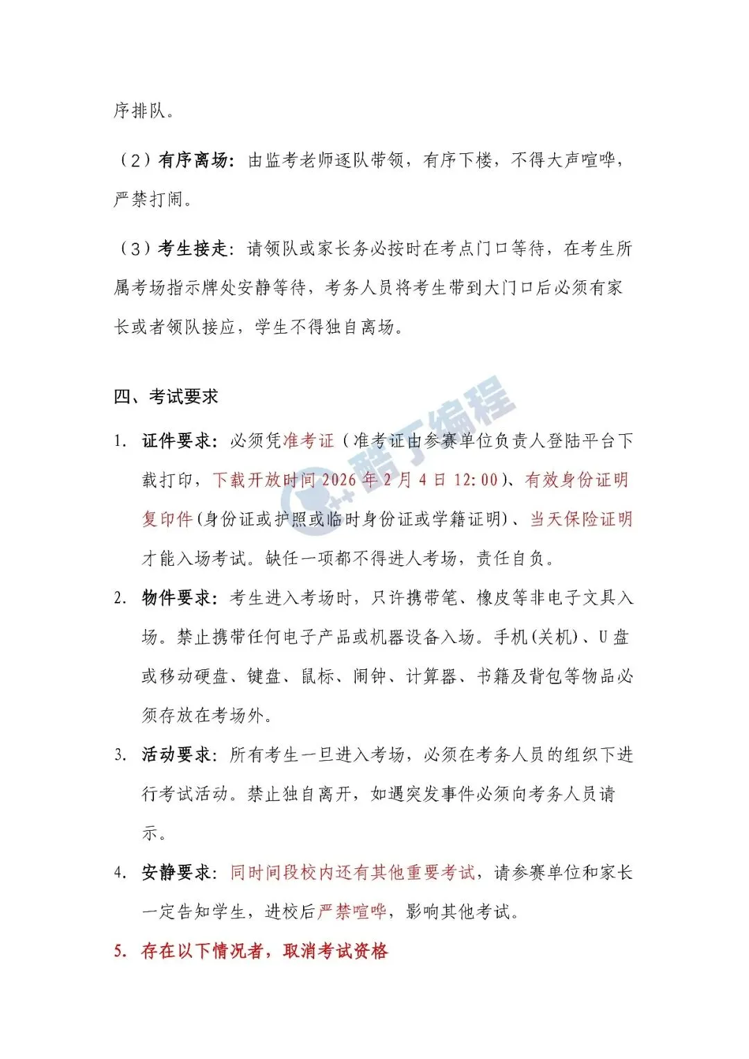 今天中午,第二届安徽省青少年AI编程普及赛(省赛)正式发布考生秩序手册,涉及各赛项具体时间、考点、入校门、接送流程、考试要求等诸多细节,考生特别要注意:证件要求:必须凭准考证(准考证由参赛单位负责人登陆平台下载打印,下载开放时间2026年2月4日12:00)、有效身份证明复印件(身份证或护照或临时身份证或学籍证明)、当天保险证明才能入场考试。缺任一项都不得进人考场,责任自负。想了解更多信息,欢迎加入酷丁编程【安徽省编程普及赛交流群】,后续通知我们也会第一时间在群里发布!