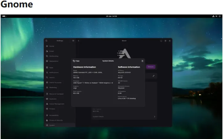 桌面环境:GNOME 49.3(默认桌面)、KDE Plasma 6.5.5、COSMIC 1.0.3(这是System76研发的新型Linux桌面)。
