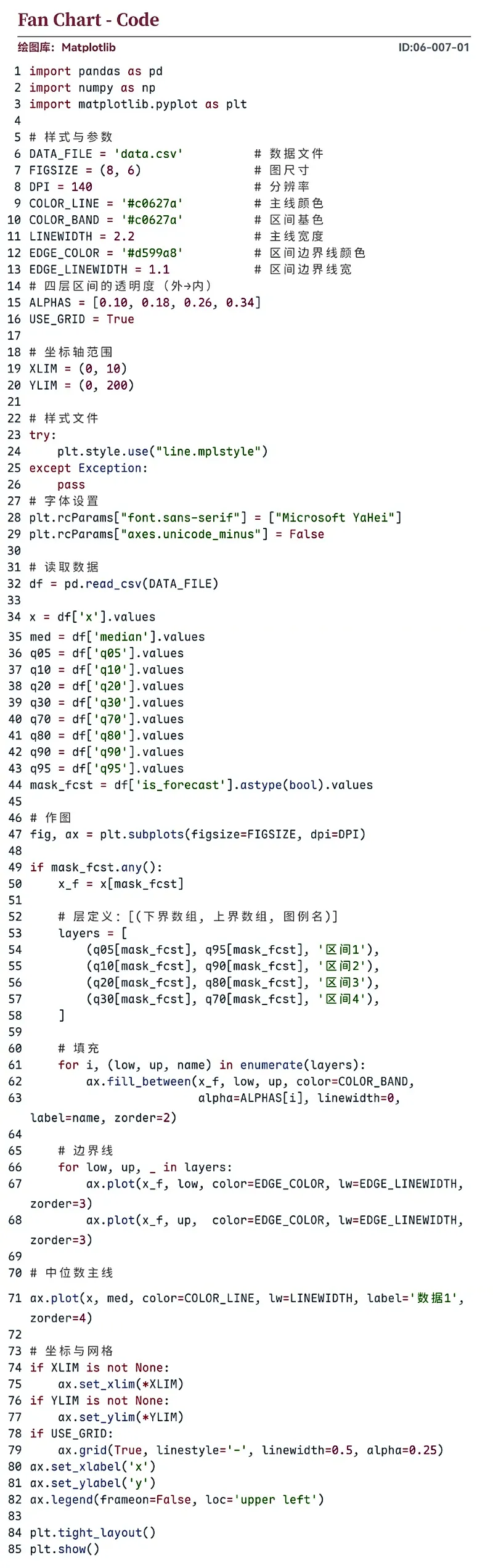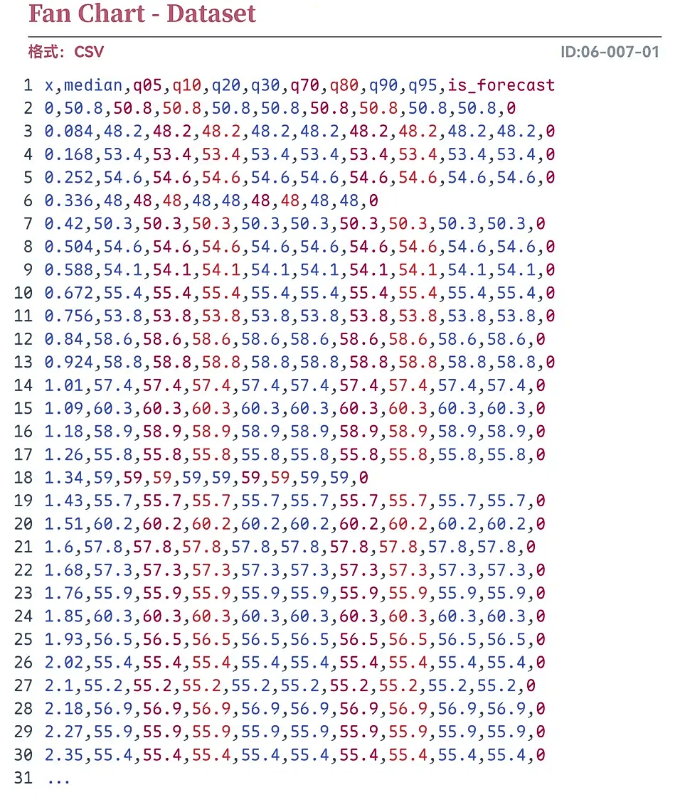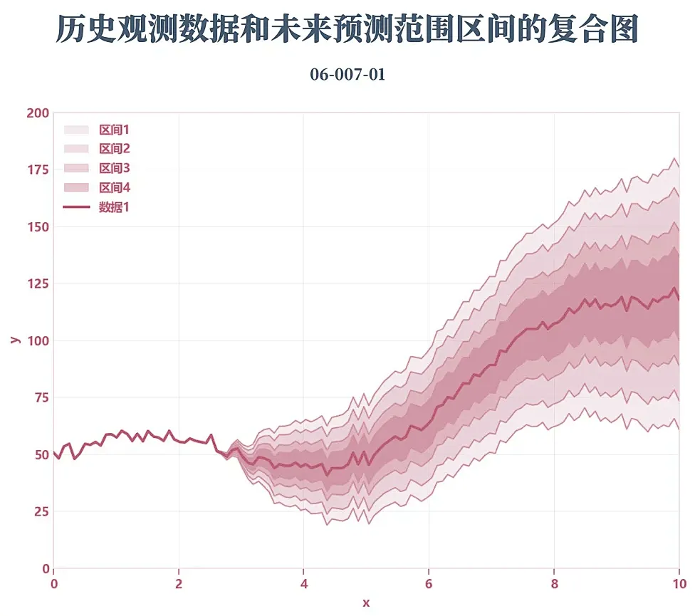扇形图在同一个图中绘制了历史观测数据和预测数据。预测数据用多层区间代表不确定性,适合展现趋势预测、风险区间或估计误差~