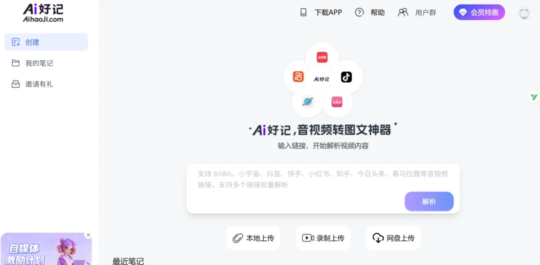 Ai好记目前支持链接音视频(B站、YouTube等直接粘贴)和本地视频(mp4/mp3/m4a)上传。新用户有免费额度,足以处理几个长视频试水。